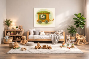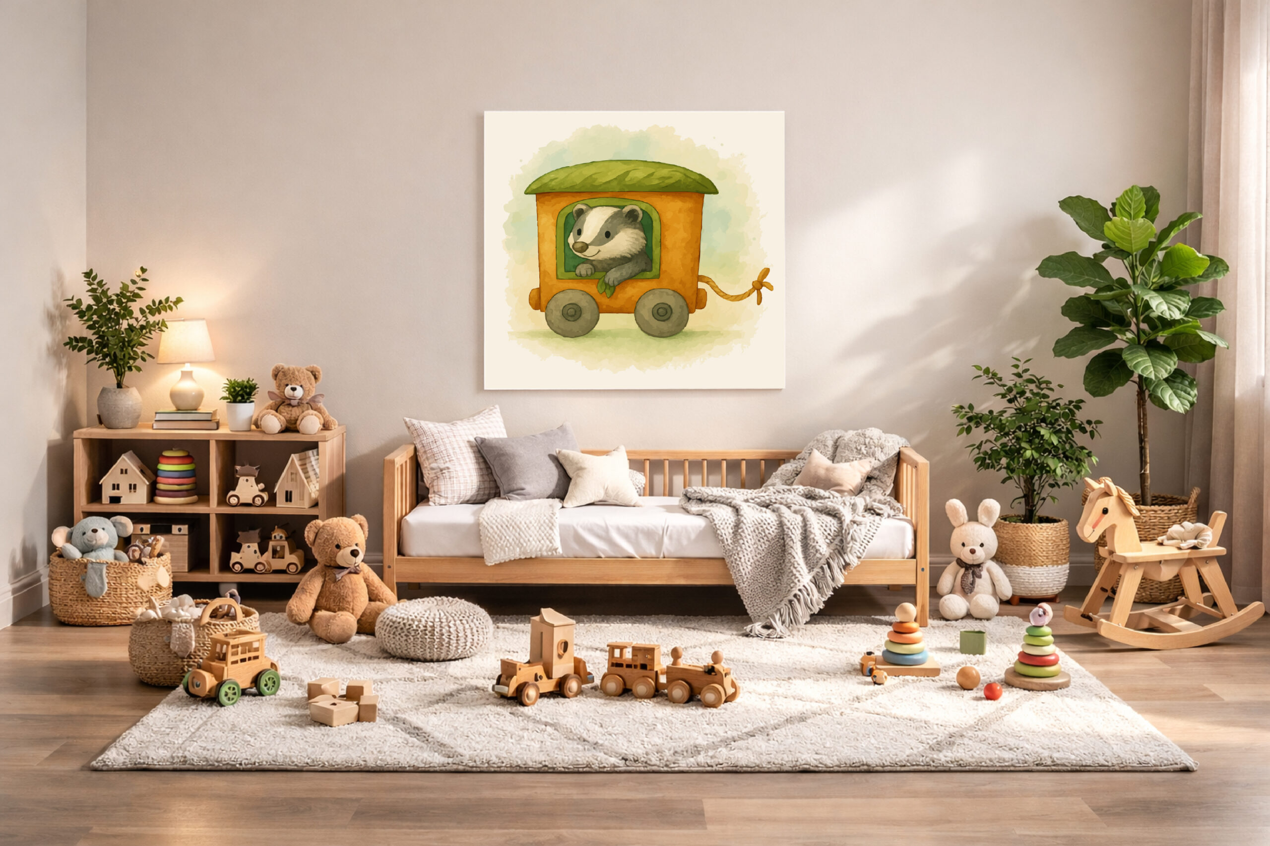 Watercolor badger train wall art printable for woodland nursery decor brings depth and quiet charm to forest-themed baby rooms. The soft pastel tones and gentle badger design create a balanced and grounded atmosphere while maintaining a warm woodland character.