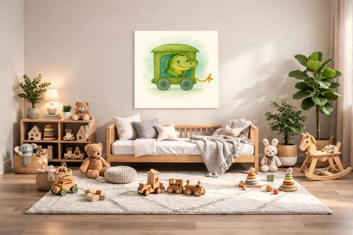 This watercolor crocodile train wall art printable is designed for modern safari nursery decor and jungle-inspired baby rooms.
