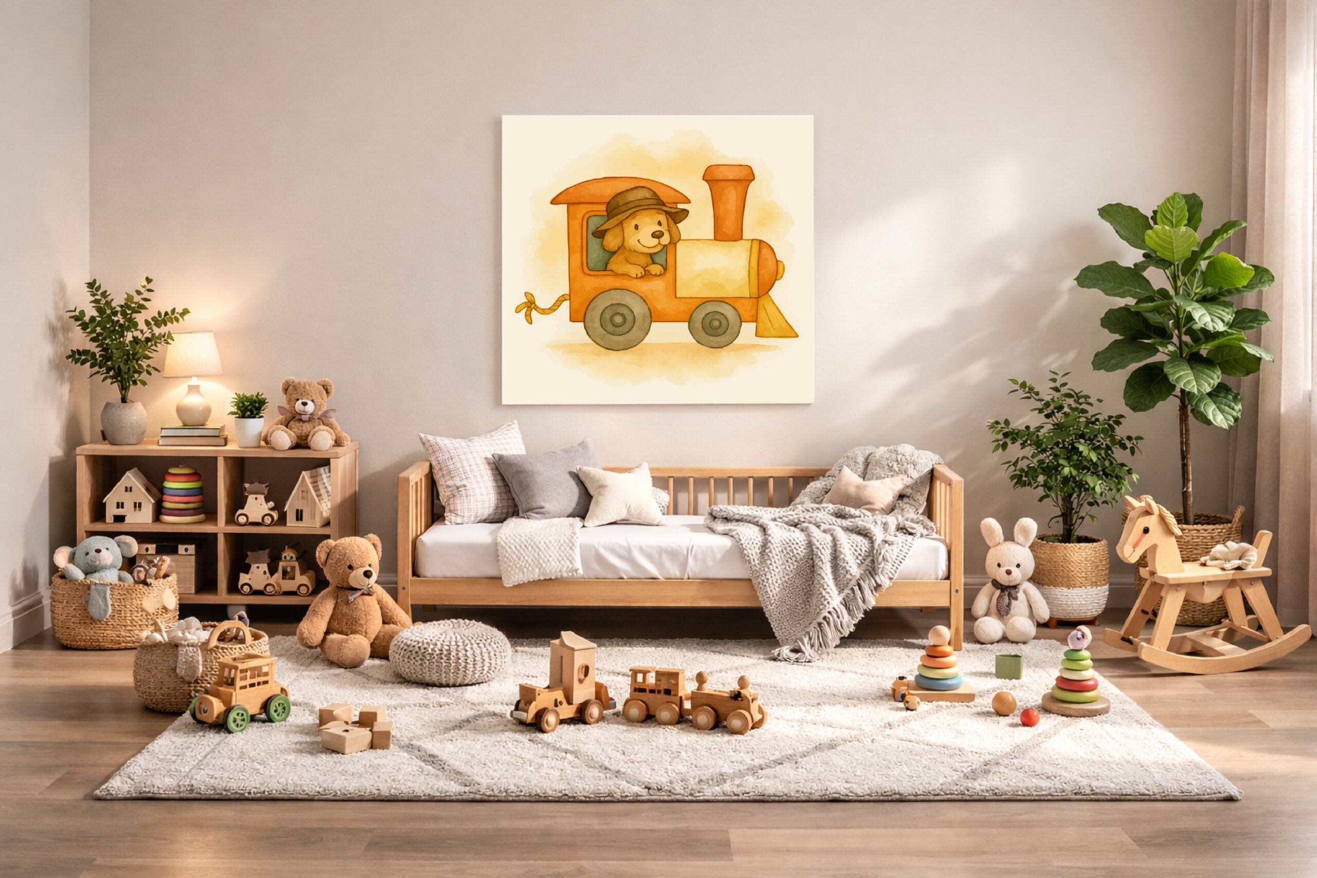 Perfect for farm-themed nurseries or countryside baby rooms, this locomotive print works beautifully as the starting piece of a coordinated animal train display.