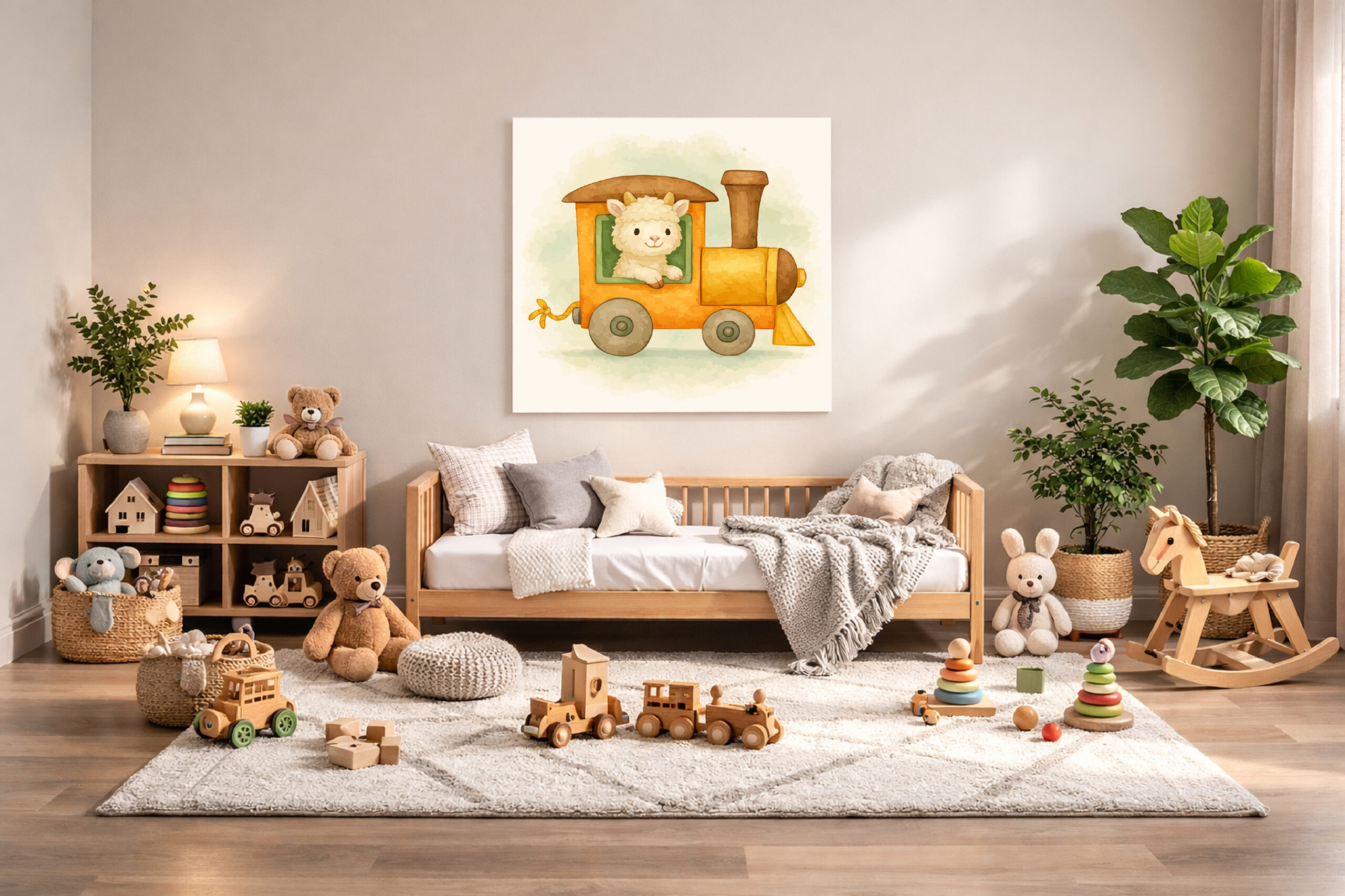 Perfect for farm-themed nurseries or countryside baby rooms, this locomotive print works beautifully as the starting piece of a coordinated animal train display.
