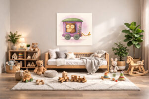 Watercolor owl train wall art printable for woodland nursery decor adds quiet wisdom and gentle balance to forest-themed baby rooms. The soft pastel palette and serene owl design create a peaceful atmosphere while maintaining a warm woodland character.