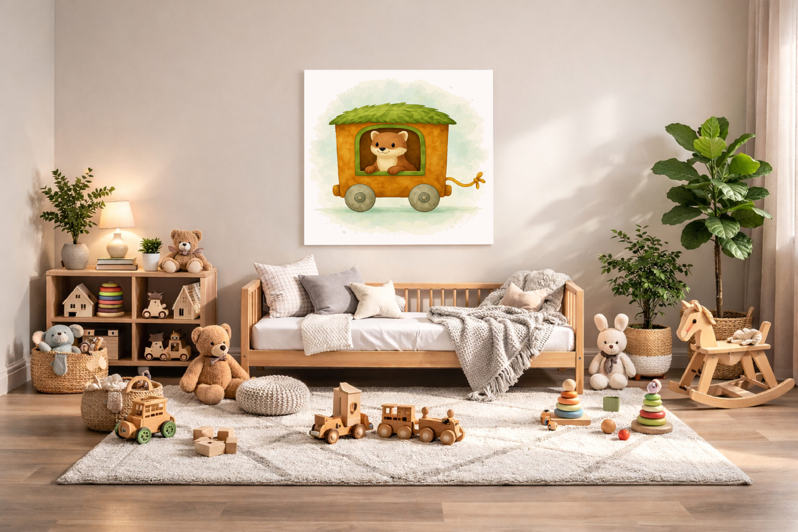 This pine marten train wall art printable brings natural woodland charm to nursery spaces. The soft watercolor textures and gentle pine marten design create a warm and calming atmosphere inspired by forest wildlife.