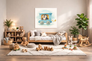 This puffin train wall art printable brings fresh arctic charm to nursery spaces. The soft watercolor textures and friendly puffin design create a calm and playful atmosphere inspired by coastal and polar wildlife.