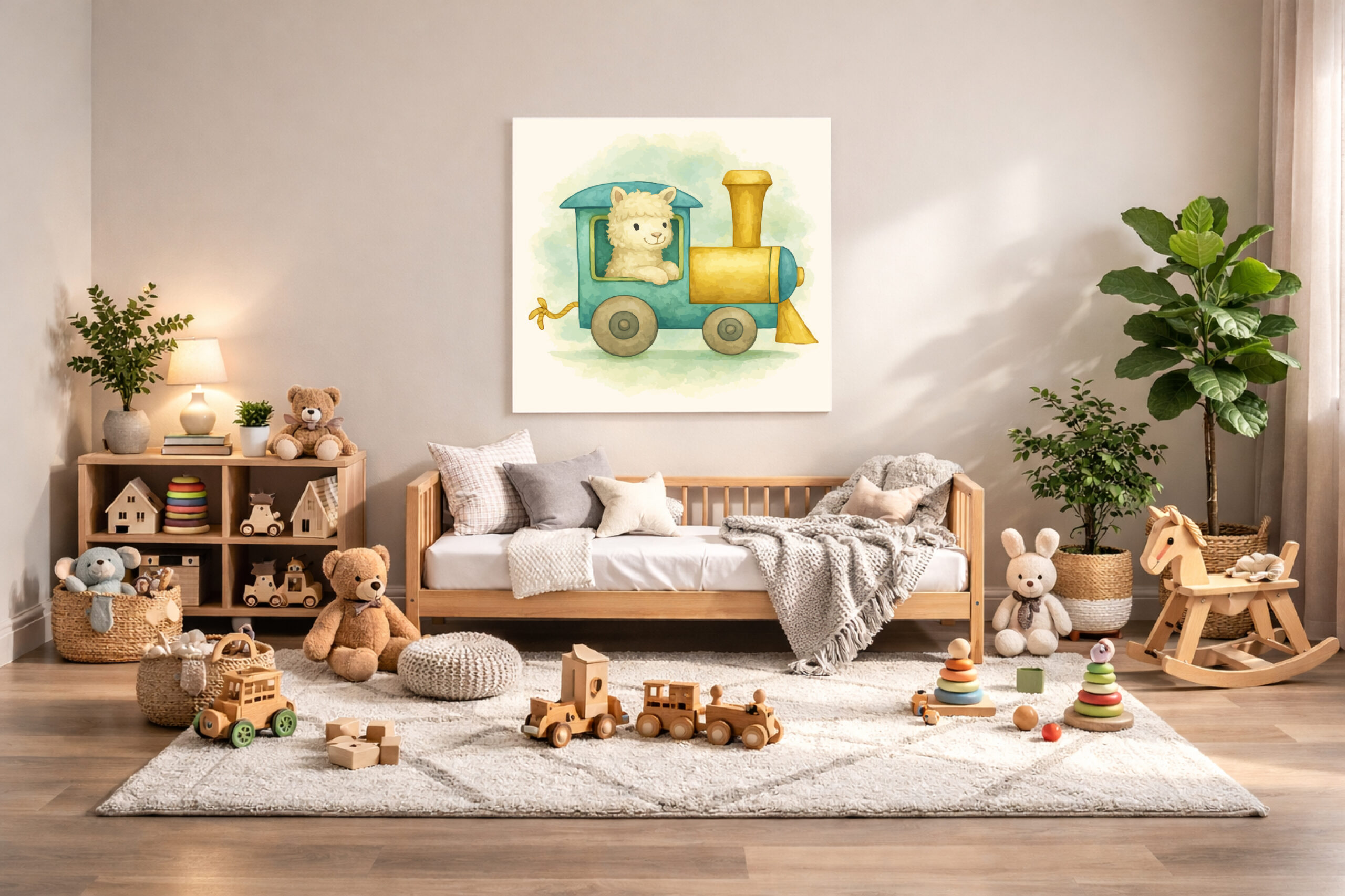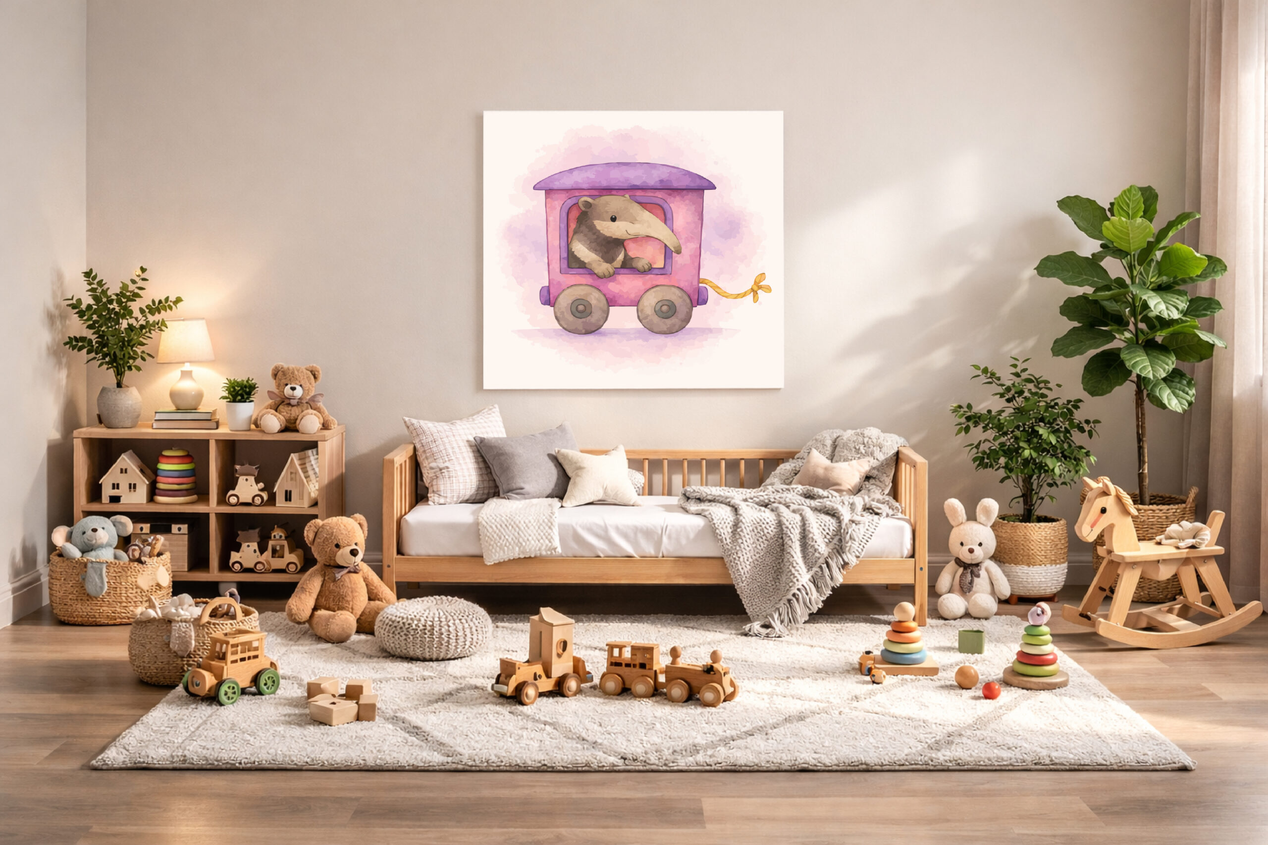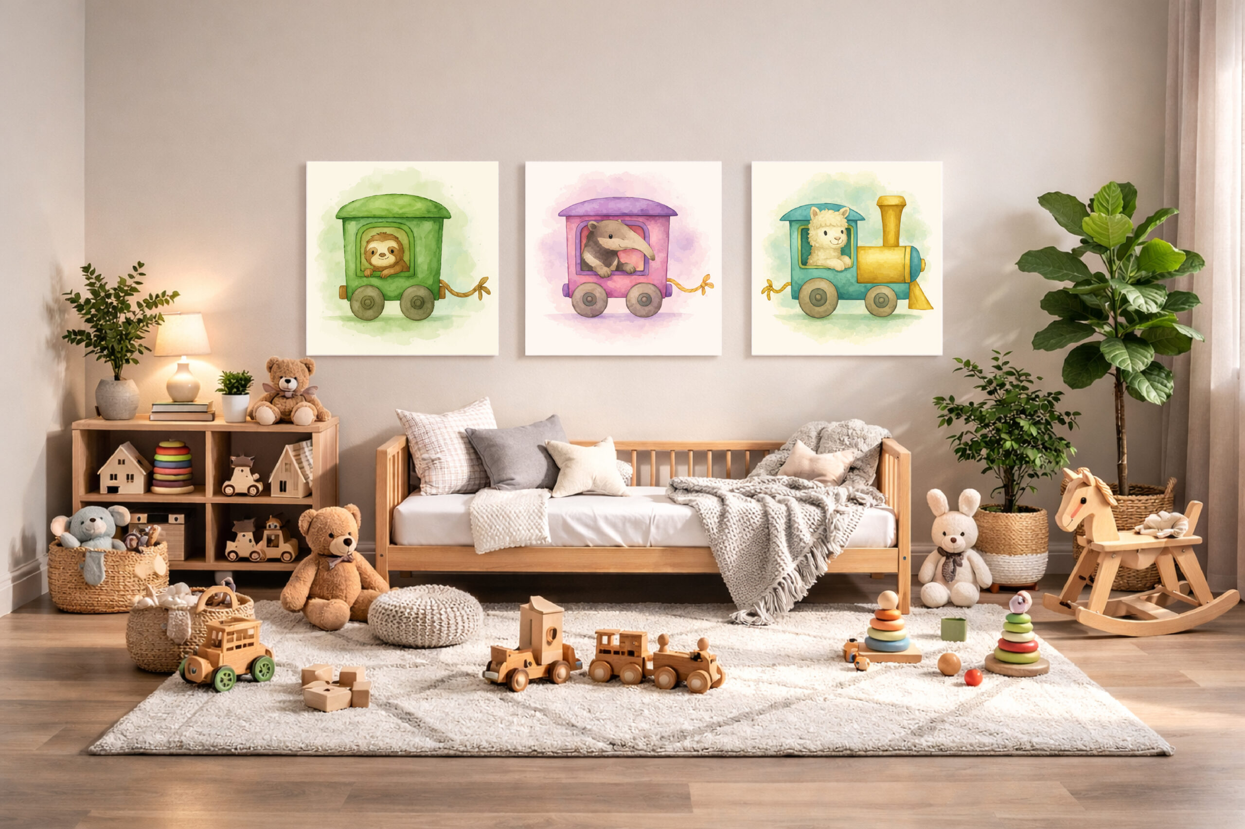 With the soft and welcoming alpaca locomotive leading the train, the curious anteater wagon adding playful movement, and the calm and relaxed sloth completing the set, this collection brings both tranquility and character to a rainforest-inspired nursery.